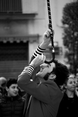Piero spielt Ukulele, Piero balanciert auf der Rola-Bola, Piero veräppelt einen Passanten, jongliert mit seinem Hut, und plötzlich steht er nur noch in gestreiften langen Unterhosen da - Piero Ricciardi, Italien, ist ein Clown wie er im Buche steht. Manchmal dreist, manchmal rührend verblödelt er sein Publikum mit Schirm, Charme und Melone und lässt dabei kein Auge trocken.